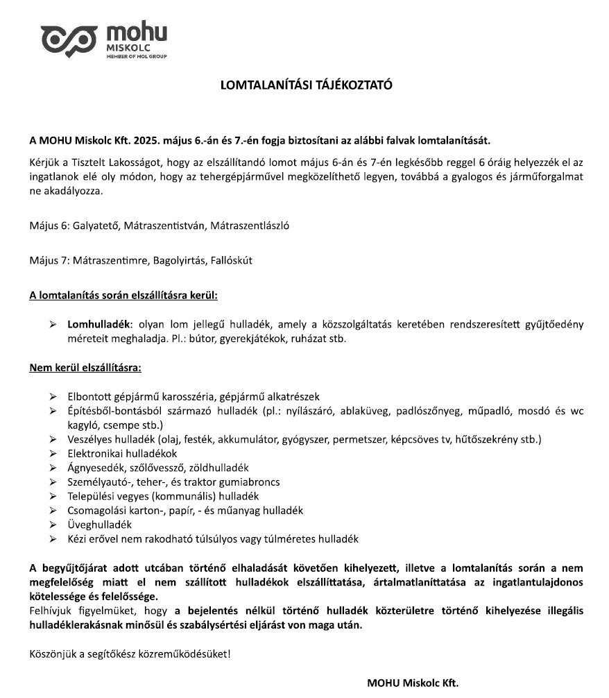 Lomtalanítási tájékoztató