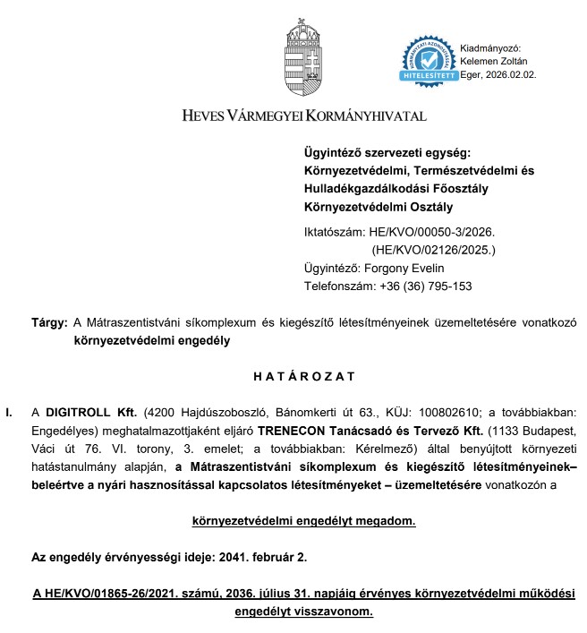 Mátraszentistváni síkomplexum környezetvédelmi engedélye Közzétételek / 2026.02.09. admin küldte be 9 February 2026 időpontban A Mátraszentistváni síkomplexum és kiegészítő létesítményeinek üzemeltetésére vonatkozó környezetvédelmi engedély