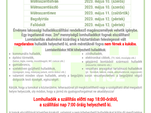 A településeken az alábbi időpontokban a szállítás előtti nap 18.00 órától a szállítási nap 07.00 óráig lehetséges maximum 2 m3 lomot kihelyezni a mellékelt plakáton szereplő szabályok betartásával!