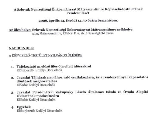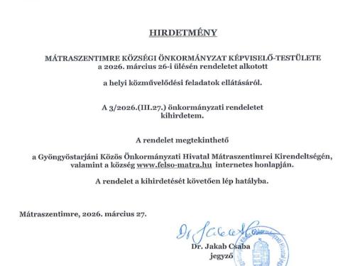Módosultak a turistautak a Csörgő-völgy Erdőrezervátumban |  Hirdetmény - Tájékoztatás Mátraszentimre község készülő településtervéről |  Gigaerős net elérhető a Felső-Mátra minden településén |  Megváltozik az orvosi ügyeleti rend Heves vármegyében, mit kell tennem? |  Ingyenes wifi az önkormányzat épületénél |  Az idegenforgalmi adó összege személyenként és vendégéjszakánként |  Átmeneti változás az ingatlan-nyilvántartási ügyek intézésésében július végén |  Álláspályázat-Intézményvezető |  Hirdetmény 2/2025 önkormányzati rendelet módosításáról |  Álláspályázat - Háziorvos |  Ingatlanértékesítési felhívás |  Közlemény a Mátraszentistváni Sípark fejlesztésére vonatkozó környezeti hatásvizsgálati eljárásról |  Felső-mátrai konyha étlapja 2026. április 6-től április 17-ig |  Felső-mátrai konyha étlapja 2026. március 23-től április 3-ig |  Gyertyakészítő szakkör Mátraszentimrén! |  Álláspályázat - Szakács vagy konyhai kisegítő |  Felhívás - Fánksütő verseny |  Falugondnoki állás pályáztatása |  A Mátraszentistváni síkomplexum és kiegészítő létesítményeinek üzemeltetésére vonatkozó környezetvédelmi engedély |  Közlemény - Területi Alapból érkező támogatásról |  Lomtalanítás Mátraszentimre közigazgatási területén 2026. májusában lesz. |  Tűzgyűjtási tilalom 2026. március 13-tól |